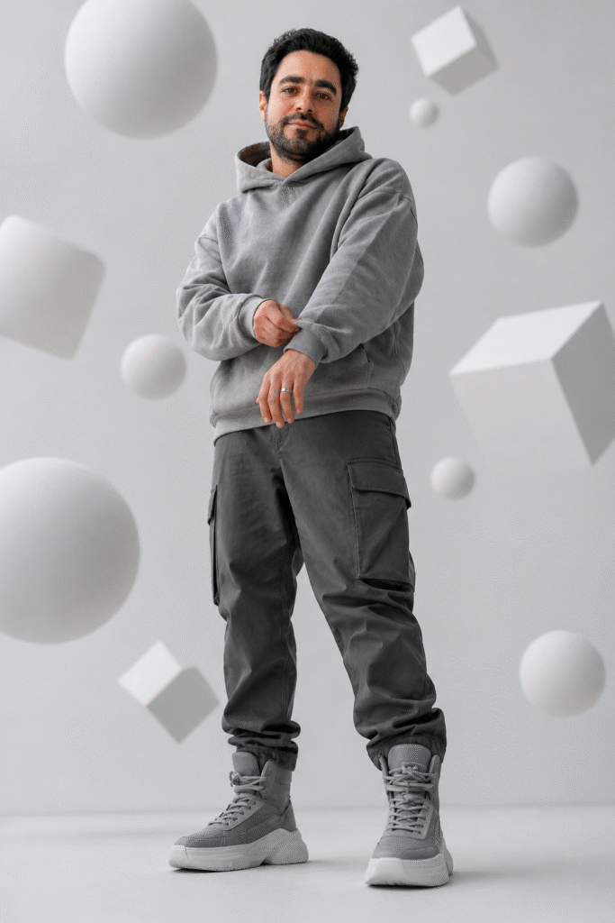 A high-fashion surrealist advertising poster for ASIC. The scene is set in a minimalist, monochrome cream studio with a semi-reflective floor, accented with soft warm orange tones. The central focus is an oversized, giant cream ASIC shoe positioned on its heel at a diagonal angle, serving as a backrest. Subtle orange detailing runs along the […]