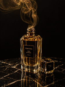 A hyper-realistic, 8K luxury perfume advertisement photograph. A single tall crystal flacon…