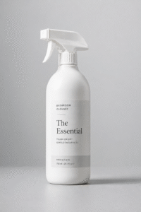 Ultra-realistic high-end commercial product photography of a minimalist bathroom cleaning product bottle.…