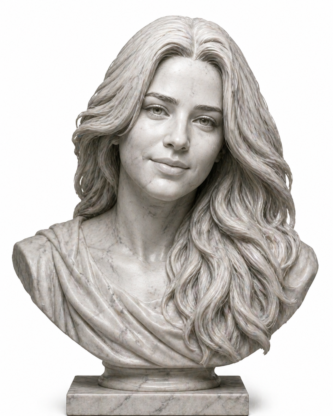 <!-- wp:paragraph --> <p>A human face portrait carved from white Carrara marble, realistic stone texture with fine grey veining, classical Greek sculpture aesthetic, smooth polished surface with matte areas, dramatic chiaroscuro lighting, museum gallery setting, monumental and timeless quality, ultra-detailed, 8K, professional art photography, keep white background.</p> <!-- /wp:paragraph -->