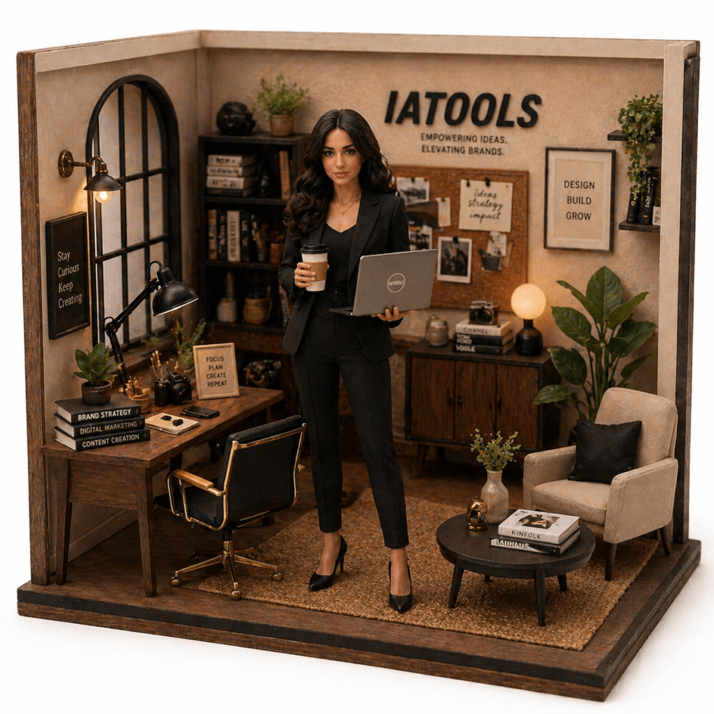 <p>A hyperrealistic miniature diorama of a confident young woman inspired by the reference image,<br>a woman dressed as a modern creative entrepreneur, wearing a black blazer, elegant black top, tailored pants and stylish heels,<br>entire scene handcrafted from layered cardboard, resin, fabric and miniature wood,<br>the figure is standing confidently while holding a laptop and coffee cup,<br>set inside a luxury creative office studio workspace,<br>surrounded by branding books, camera gear, desk lamp, plants, smartphone, coffee table, notebooks and modern decor,<br>warm neutral color palette with black, beige, walnut wood and soft gold accents, warm cinematic studio lighting,<br>visible handcrafted paper, wood grain and fabric textures on every surface,<br>macro photography, shallow depth of field,<br>8K hyperrealistic, studio lighting, white seamless background,<br>professional miniature art, ultra detailed</p>