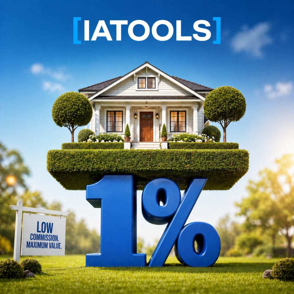 <p>A miniature white craftsman-style house with brown wooden door sits atop a perfectly manicured floating hedge platform, supported by a large 3D blue "1%" typography sculpture on lush green grass, flanked by rounded topiary trees, bright sunny day with soft blue sky and bokeh background, real estate advertisement concept, creative surreal product photography composition, warm natural daylight with soft shadows, fresh green and sky blue color palette with white and brown accents, photorealistic 3D render style, commercial advertising aesthetic, ultra-detailed, 4K, sharp focus, professional studio lighting, high-end marketing visual. Use this text for the logo [IATOOLS]. create the image in 4:4 proportion and pixels.</p>