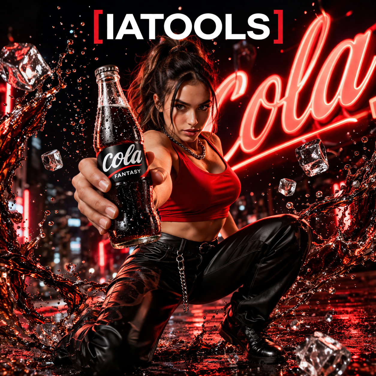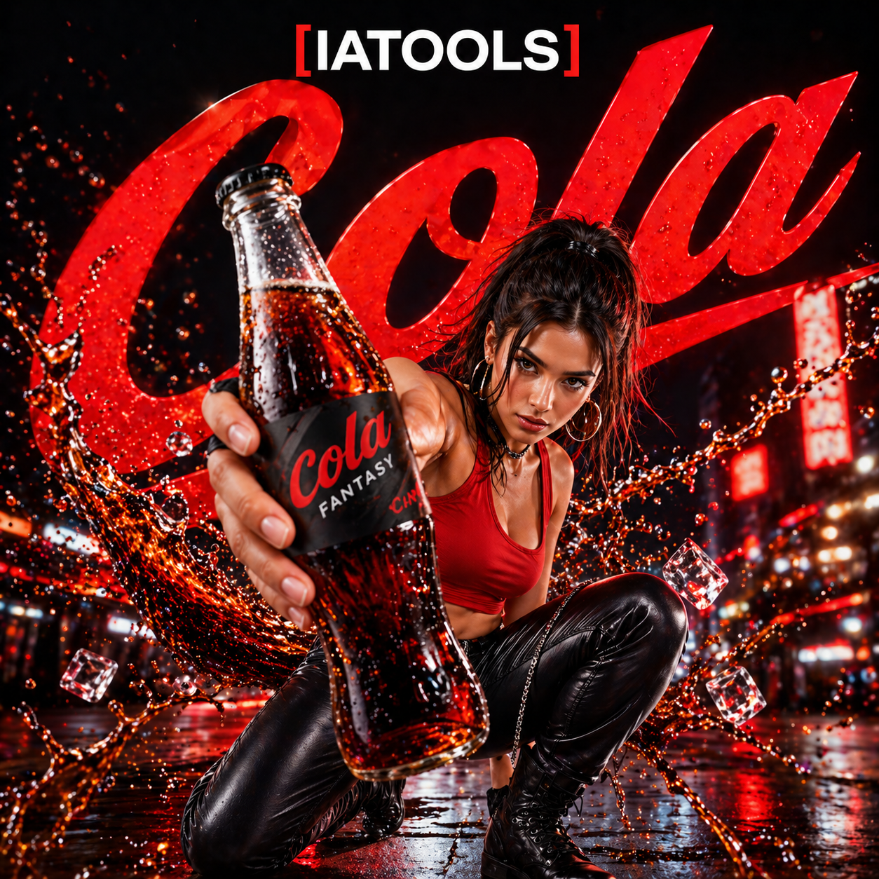 <p>A professional beverage advertisement featuring [Character Description]. She is in a dynamic action crouch, holding a glass bottle of black cola fantasy can and toward the camera. She wears a red crop top and black leather pants. The background is a blurred, vibrant night city with red neon lights. Cinematic liquid splashes of dark cola and ice cubes swirl around her. High-quality commercial photography, bold lighting, "IA-Tools" logo at the top. Use this text for the logo [IATOOLS]. create the image in 4:4 proportion and pixels. use "cola" word in the background with a classic italic bold style. create the image in 4:4 proportion and pixels.</p>