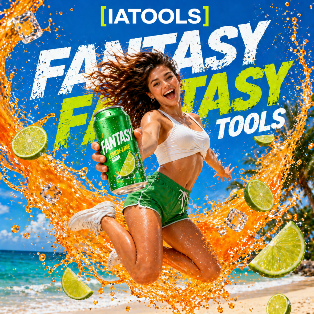 <p>**Composition:** The image is framed in a 4:4 ratio, focusing on the character at the center, surrounded by dynamic splashes and tropical elements. The background features the words “FANTASY, FANTASY TOOLS” in modern italic bold style, subtly integrated yet legible, enhancing the overall theme without overpowering the main subject.</p>