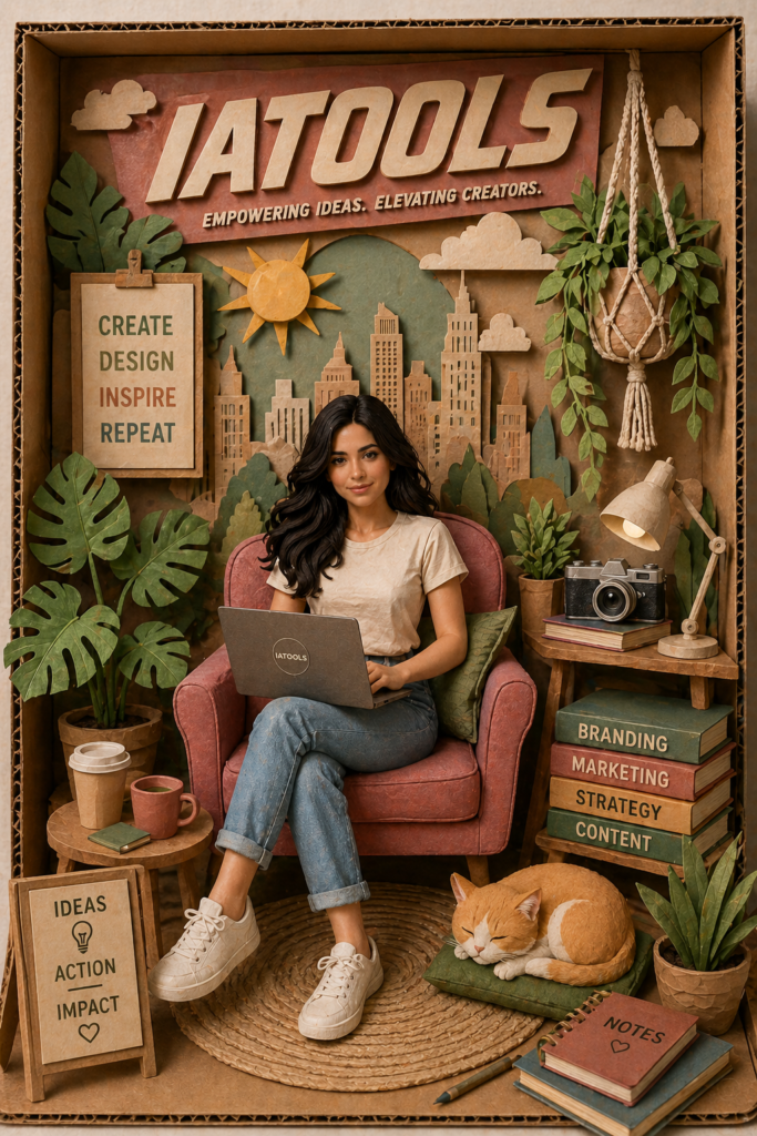 <p>A young woman with long dark wavy hair sits in a dusty pink armchair holding a laptop, surrounded by an intricate 3D paper craft diorama scene, cozy creative workspace aesthetic with layered cardboard cityscape backdrop, paper cut sun and clouds, hanging macrame plants, sleeping orange and white cat, stacked books labeled branding marketing strategy content, vintage camera, desk lamp, coffee cups, monstera leaves, motivational signs reading "Create Design Inspire Repeat" and "Ideas Action Impact", warm earthy color palette of terracotta pink sage green kraft brown and cream, soft diffused natural lighting creating gentle shadows, whimsical handcrafted tactile texture throughout, mixed media paper sculpture art style, shadowbox diorama aesthetic, hyperrealistic paper craft illusion with photorealistic human figure, intricate miniature scene composition, 4K, ultra-detailed, award-winning craft photography, studio lighting, sharp focus, artstation trending. Use this text for the logo [IATOOLS] and at the top. use "IATOOLS" word in the background with a modern a italic bold style.</p>