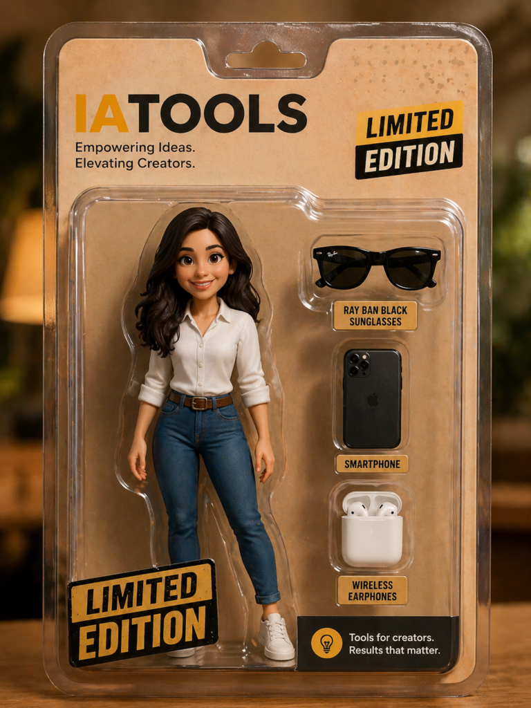 <p>Action figure packaging display of "IATOOLS" simple young woman, stylized cartoon female figure with colorful and yellow friendly smile style. wearing white shirt, blue jeans pants, displayed in clear plastic blister pack against tan cardboard backing, add accessories include matte black full-face ray ban black sunglasses, smartphone, phones. Decorate with "Limited" and Use the text "IATOOLS" brand for the logo in top corner, product photography style with soft even studio lighting, warm earth tone color palette with browns tans and grays, nostalgic toy collectible aesthetic, clean commercial composition, hyper-realistic miniature figure with subtle plastic sheen, 4K, ultra-detailed, sharp focus, professional product shot. use the image for reference. Add text like "Limited Edition in bold."</p>