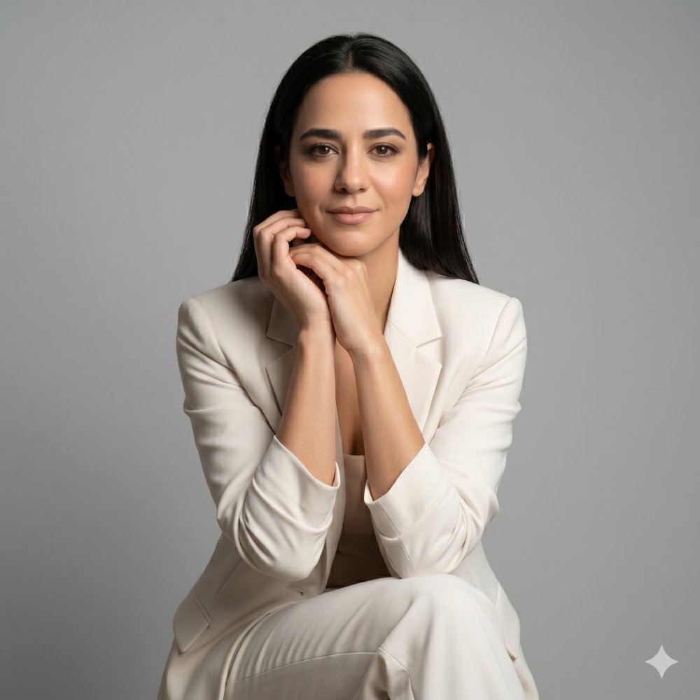 <p>Create a hyper-ultrarealistic 1:1 square studio portrait using my exact face and identity, preserving precise facial proportions, bone structure, eye spacing, nose shape, lips, and jawline with zero alteration. Match the seated three-quarter pose: body angled about 20° to the right, face turned directly toward camera, hands gently clasped near chin with fingers softly interlaced, elbows subtly resting on knee forming a natural triangular composition, spine upright, shoulders relaxed yet structured, chin slightly lowered, direct eye contact, calm confident closed-lip soft smile. Outfit: minimalist monochrome ivory tailored suit in matte crepe with soft shoulder definition and clean lapels, sleeves slightly pushed, neutral nude inner top, absolutely no jewelry or accessories (no earrings, rings, bracelets, necklaces). Background: seamless soft neutral gray studio backdrop with subtle gradient depth, matte finish, no props, no texture. Lighting: diffused key light from camera left at 45°, soft sculpting highlights on left cheekbone and forehead, gentle shadow along right jawline, balanced fill without flattening, natural circular catchlights, luminous yet realistic skin glow. Camera realism: full-frame 85mm lens at f/2.8, crisp facial focus with natural depth falloff, professional editorial framing upper torso to below knee, accurate optical compression, HDR balanced, visible skin micro-texture, natural fabric grain and true drape physics, no plastic smoothing. Hair sleek, long, straight, softly tucked behind ears; makeup warm neutral glam with sculpted brows, soft taupe eyeshadow, subtle liner, natural lashes, warm blush, satin nude lip. Maintain refined luxury studio aesthetic with no deviation.</p>