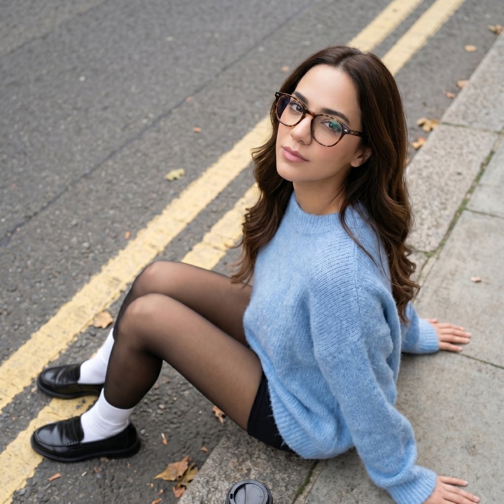 <p>The subject is seated on the edge of a concrete curb along a quiet street, captured from a high, top-down angle. Her body is angled diagonally across the frame, with one knee bent upward while the other leg extends slightly forward, creating a relaxed yet intentional asymmetry. Both hands are placed behind her on the ground, palms flat, supporting her weight and opening the chest subtly. Her head tilts upward toward the camera, but her face is not fully squared — she turns slightly at a 45-degree angle, creating a natural, candid look. Her gaze meets the camera softly with a calm, composed expression, lips relaxed, eyes alert but effortless.Tortoiseshell Dior-inspired optical glasses with rounded square frames, translucent brown acetate, medium thickness, perfectly fitted to the face.</p>
