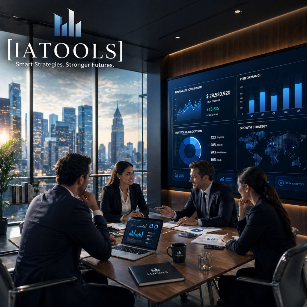 <li><strong>Camera Lens</strong>: 35mm lens for a slightly wider perspective, allowing for depth of field and intimate focus on the professionals while subtly blurring the background. Use this text for the logo [IATOOLS]. create the image in 4:4 proportion and pixels.</li>