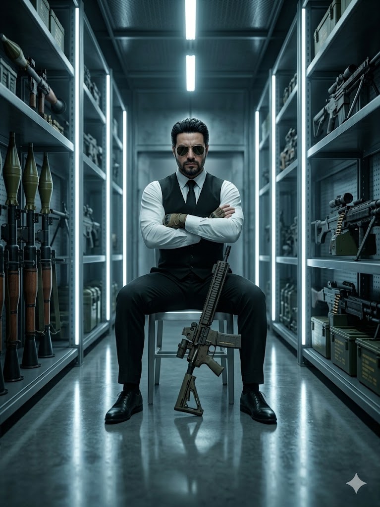 <p>A hyper-realistic, 8k, cinematic low-angle full shot emphasizing the immense commanding presence of the subject seated regally on a minimalist steel chair in the center of a massive weapons vault aisle. The subject, with uploaded face as reference, slicked hair, and gold-rimmed aviators, has their arms crossed firmly over their chest, wearing the immaculate white shirt, black tie, and fitted waistcoat. They look down towards the camera with an intimidating, calm aura. The lighting is moody, cool-toned, coming from vertical LED strips lining towering metal shelves on either side, which are packed densely with heavy ordnance (e.g., RPG launchers, .50 caliber sniper rifles, belt-fed machine guns). The floor is polished concrete reflecting the vertical lines of the weapons. Shallow depth of field, sharp focus on the subject. <br><br><br><br></p>
