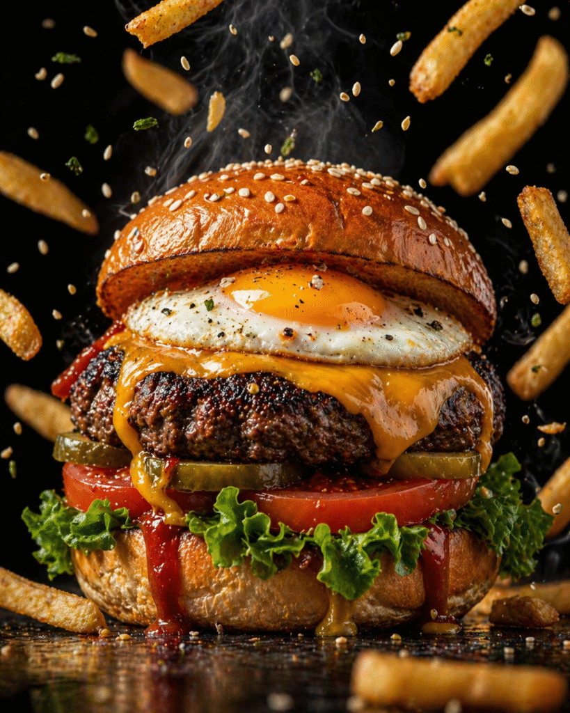 <p>Ultra-realistic, high-end commercial food photography of a premium gourmet burger, designed to look irresistibly craveable and cinematic. A towering burger stack featuring: – thick juicy beef patty with deep char grill marks and caramelized crust – melted cheddar cheese cascading naturally over the meat (glossy, rich texture) – perfectly fried sunny-side egg with a vibrant golden runny yolk – crisp fresh green lettuce with natural curl and moisture – thick-cut ripe tomatoes with visible seeds and juice sheen – glossy pickles with wet reflective surface The brioche bun is golden, slightly glossy, lightly toasted with sesame seeds, slightly compressed to emphasize softness and realism. 🔥 Dynamic Action Elements (KEY FOR CONVERSION): – golden crispy fries exploding mid-air around the burger – flying sesame seeds and herb flakes frozen in motion – sauce drips (ketchup + mustard) flowing naturally down the layers – subtle steam rising from patty and fries (fresh, hot feel) 🎯 Lighting (CRITICAL): – strong cinematic overhead spotlight with warm golden tones – secondary soft side fill (left side) revealing textures and layers – high contrast lighting to emphasize gloss, depth, and texture – specular highlights on cheese, yolk, and vegetables 🎬 Composition: – centered hero shot – slight low angle for dominance and appetite appeal – shallow depth of field (sharp center, soft falloff) – black seamless background for dramatic contrast 🧵 Texture Detail (ULTRA IMPORTANT): – visible meat grain – cheese melt gradients – bread pores and micro cracks – moisture droplets on vegetables – salt crystals on fries 🎨 Color Palette: deep black, golden yellow, rich red, fresh green, warm brown 📸 Camera: 85mm macro lens f/2.8 ultra sharp focus on burger core 🎞 Style & Mood: luxury restaurant advertising bold, indulgent, irresistible “you can almost taste it” realism 📊 Quality: 8K resolution hyper-realistic studio-grade commercial photography 🚫 Negative Prompt (CRITICAL): blurry, low resolution, flat lighting, dull colors, messy composition, plastic food look, unrealistic textures, overprocessed, CGI feel, noise, watermark, text</p>