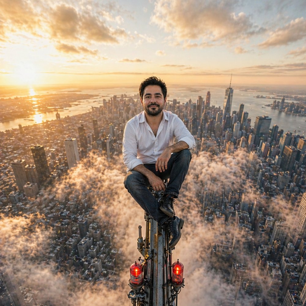 <p>A breathtaking, hyper-realistic aerial photograph captured from a high-altitude drone perspective, showcasing a man sitting casually and completely relaxed on the absolute pinnacle spire of a supertall megastructure skyscraper; the man, dressed in dark denim jeans and a crisp white shirt with rolled sleeves, sits with a composed posture, his uploaded 100% face as reference, looking out calmly over a sprawling, densely packed global metropolis at dawn; he is perched on a narrow steel beam just inches wide, high above the clouds that veil the lower city; the skyscraper spire is rendered in meticulous detail, showing the weathered metallic aircraft warning lights, bolts, and lightning rods; far below, through gaps in the clouds, the city lights are just beginning to fade as the sun rises, casting long, dramatic golden shadows across the urban landscape; the composition emphasizes the terrifying height and the impossible juxtaposition of the calm human figure against the vertical scale of modern engineering; the lighting is the soft, warm golden light of early sunrise; captured with a wide-angle lens for extreme perspective and a shallow depth of field, focused sharply on the man.. 2:3r</p>
