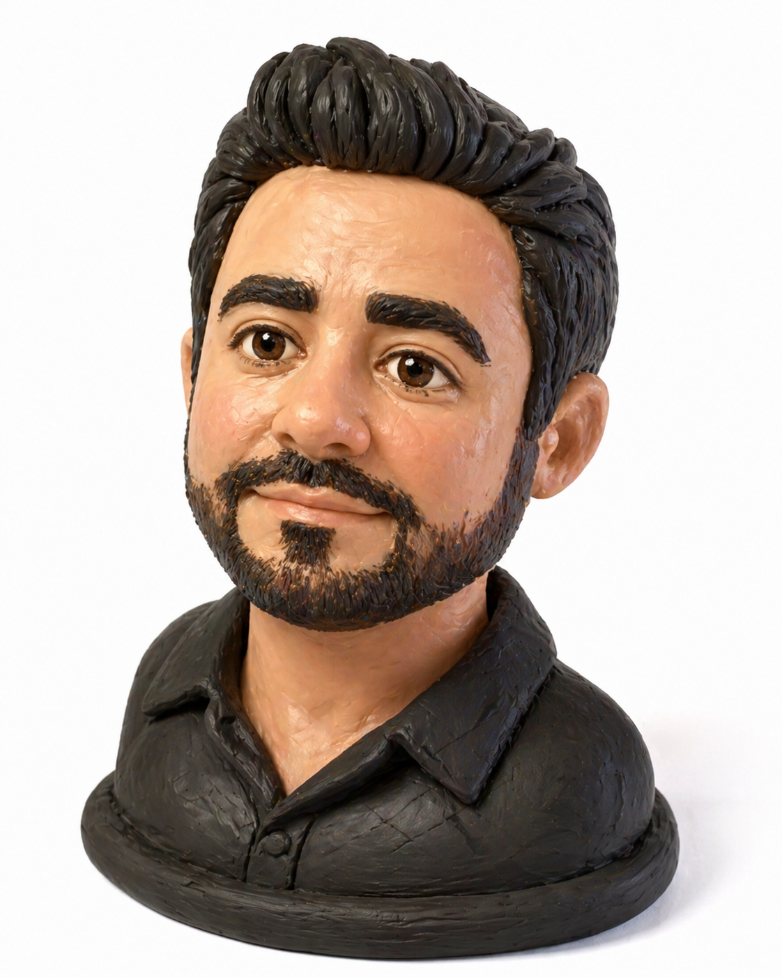 <p>Hyper-realistic isometric 3D portrait bust of a human face sculpted entirely in smooth clay plasticine, rounded puffy cheeks and forehead, soft chunky nose and lips, large expressive eyes with glossy clay surface, pastel skin tones in peach and cream, subtle fingerprint texture on clay surface, soft-box studio lighting with gentle ambient occlusion shadows, isolated on white background, Octane render quality, ultra-detailed, 8K</p>