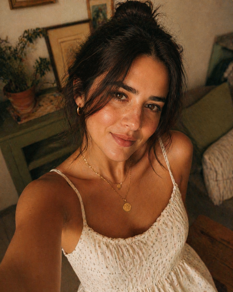 <p>A warm, intimate selfie-style portrait of a young woman with dark brown hair styled in a loose bun with soft curtain bangs. She has a bridge of prominent freckles across her nose and cheeks, with a slight, natural smile. She is wearing a white dotted spaghetti-strap sundress and delicate gold jewelry, including layered necklaces and small hoop earrings. The lighting is soft and indoor, casting a warm, slightly yellow-toned vintage glow. The color palette is earthy, with muted greens and warm ambers. Shot with a high-angle perspective, natural skin texture, visible film grain, 35mm film aesthetic, shallow depth of field</p>