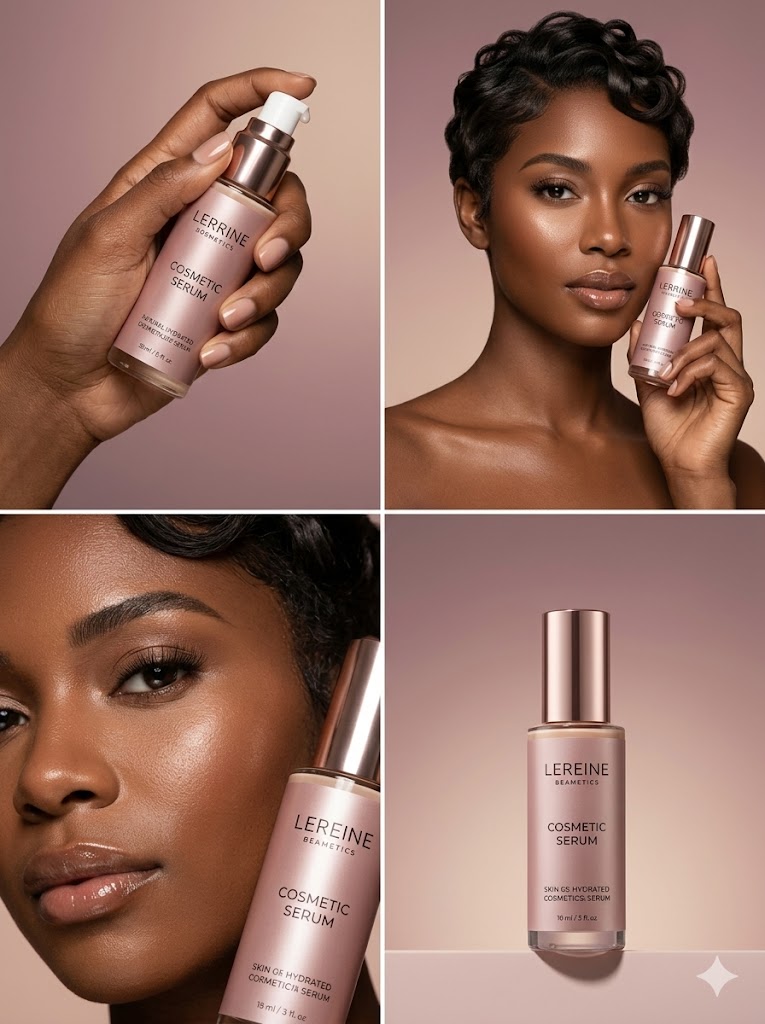 <p>Ultra-detailed 8K luxury cosmetic campaign poster in a clean 2x2 grid layout with equal spacing and thin clean dividers. Aspect ratio 3:4. Background color automatically harmonized with product packaging tone — soft dusty rose, muted mauve, warm champagne beige, creamy almond, or elegant pastel gradient, clean studio finish. High-end commercial beauty lighting: diffused but directional, controlled glossy highlights, soft natural shadows. Overall mood: premium, sensual, editorial, modern skincare campaign. The model is a sexy African woman with deep melanin skin tone, glowy luminous hydrated skin finish, confident and sensual yet elegant expression, natural glam makeup with defined lashes and glossy lips, vintage-inspired short hairstyle with sleek finger waves on the sides and neatly styled curls on top. TOP LEFT — hand-focused product interaction: a well-manicured hand holding and gently squeezing the product, macro commercial lighting, sharp texture detail, realistic product label clearly visible. TOP RIGHT — mid portrait of model presenting the product near her face, soft beauty lighting with subtle highlights on her skin, product label naturally visible. BOTTOM LEFT — tight close-up beauty shot of model skin and product side by side, shallow depth of field, emphasis on skin glow texture and product surface detail. BOTTOM RIGHT — hero product shot, product alone on a minimal pedestal or floating, subtle shadow, premium commercial finish, ultra-sharp label and texture. Realistic skin texture, photorealistic product rendering, cohesive color palette across all four panels.</p>
