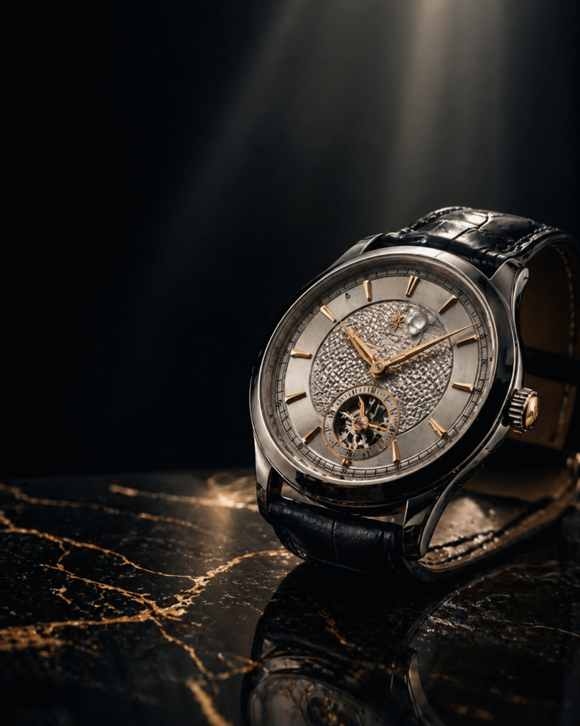 <p>A cinematic hyperrealistic luxury watch advertisement. The watch is an ultra-premium timepiece with a polished stainless steel case, sapphire crystal glass, intricate silver and gold dial with fine applied hour markers, a smooth black or deep navy crocodile leather strap, and precise mechanical movement details visible through subtle reflections. The watch is positioned at a slight 3/4 angle resting on a dark polished marble surface with soft veining in black and gold. Background: deep charcoal black seamless gradient with subtle volumetric light rays piercing from above, creating a dramatic halo effect around the watch. Lighting: single directional dramatic studio spotlight casting sharp specular highlights along the case edges, bezel, and crystal, with a warm golden secondary fill light from below. Reflections on the marble surface are sharp and controlled. Ultra-sharp macro detail on the dial texture, crown, hands, and strap stitching. A single perfectly placed water droplet on the crystal to suggest precision engineering and water resistance. No people, no clutter. Generous negative space on the left side for headline text overlay. Cinematic depth of field with sharp product focus and softly blurred background bokeh. Color palette: deep black, charcoal, warm gold, silver, midnight navy. 8K ultra-detailed commercial product photography, Rolex-level advertising aesthetics, mood: powerful, prestigious, timeless, masculine elegance.</p>