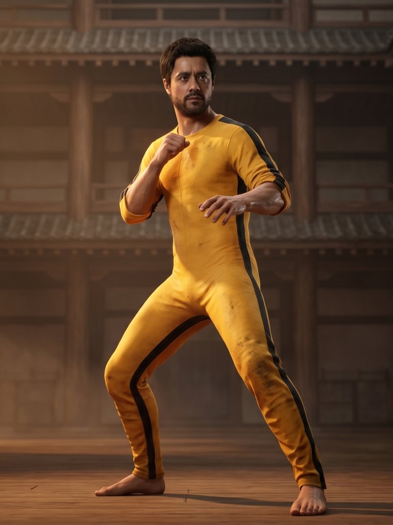 <p><br>A hyper-realistic cinematic action scene inspired by classic martial arts films, featuring a highly skilled fighter (use uploaded image as STRICT identity reference — exact face, beard, proportions, skin tone, no alteration, no stylization, no identity drift) wearing a bright yellow tracksuit with black side stripes, standing inside a multi-level pagoda-style interior.<br>🧬 IDENTITY LOCK (CRITICAL)<br>– Preserve 100% facial structure from reference image</p>