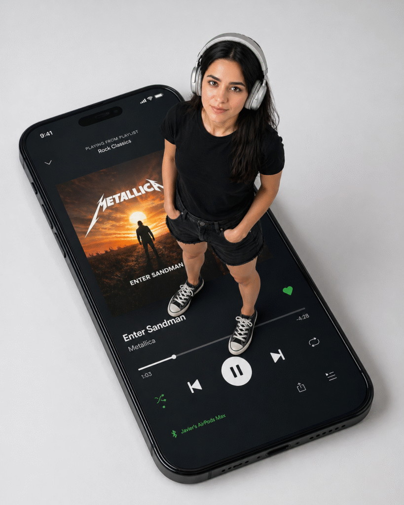 <p>Create a sleek, modern forced-perspective portrait of a girl standing on top of a gigantic smartphone screen, with extreme scale contrast. The phone dominates the environment, and the subject appears life-size and physically grounded on its surface. Subject Girl with natural dark long hair, well-groomed. Expression Neutral, calm, confident. Looking directly upward at the camera. Outfit +black tshirt shor pants and black converse sneakers), metallic silver over-ear headphones (AirPods Max style). Pose (LOCK) Standing naturally, body slightly angled left (~10–15°). Head tilted upward toward camera. Weight evenly balanced. Grounded, realistic stance. No exaggerated posing. Scale (CRITICAL LOCK) Phone occupies 85–90% of the lower frame area (the Phone's upper side on the left, the lower side on the lower right). Subject occupies ~65–75% of frame height. Full body visible (no cropping). Subject must feel life-size relative to phone surface. Feet firmly planted with realistic contact shadow. No floating or miniature effect. Camera (HARD LOCK) Strict top-down high angle (70–80° overhead). Camera nearly vertical — not diagonal or cinematic. Flattened perspective like real top-shot photography. Phone edges clearly visible in perspective (not flat front view). Environment & Device Giant black iPhone, minimal modern design. iPhone head on left side in the frame. Screen displays Spotify dark UI with album art interface featuring the song "Enter Sandman" by Metallica, complete with album artwork depicting a stylized sunset and a human silhouette. UI elements subtle, realistic, not distracting. Phone placed on seamless light grey-white studio surface. Background Infinite seamless light grey-white studio sweep. No horizon, no edges, no walls, no textures. Clean, minimal, distraction-free. Soft gradient falloff for depth. Lighting Soft high-key studio lighting from above. Clean, diffused shadows. Subtle ambient shadow under phone. Realistic drop shadow from subject onto glowing screen. Rendering Style Ultra photorealistic (no AI look). Natural skin texture (visible pores, no smoothing). Accurate fabric physics (hoodie folds important). Clean edges, no halo or cutout artifacts. Lens & Technical 28–35mm lens (slightly wide for scale exaggeration). f/2.8, mostly sharp focus. High detail, 8K realism. Aspect Ratio 4:5 vertical (composition built for this, no crop simulation). Negative Prompt no low angle, no eye-level shot, no cinematic tilt, no front view, no small phone, no tiny subject, no floating feet, no wrong perspective, no AI skin smoothing, no bad proportions</p>