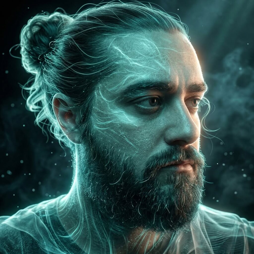 <p>A cinematic portrait of an ethereal figure formed from glowing teal and aqua energy strands. The body is semi-transparent, made of flowing light and fine particles, with a soft, melancholic expression and a highly detailed, realistic face. Hair loosely tied, with delicate wisps floating in the air. Surrounded by a futuristic, spectral aura, wearing luminous fabric that seamlessly blends into energy threads. Set against a deep black background for strong contrast, with dramatic side lighting, volumetric glow, and ultra-detailed textures. A fusion of fantasy and sci-fi with a mystical atmosphere, hyper-realistic quality, 8K resolution, shallow depth of field, cinematic composition, soft rim light, and high contrast. Digital art masterpiece.</p>