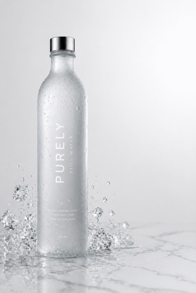 <p>A hyperrealistic minimalist product photography shot of a premium water drink bottle.<br>The bottle has a sleek elongated silhouette with a frosted matte finish, clean smooth<br>surfaces, a slim modern cap in brushed silver, and a minimal label with clean sans-serif<br>typography in light grey and white tones. The bottle is placed upright centered on a<br>smooth white marble surface with subtle soft grey veining. Background: seamless pure<br>white fading into soft light grey gradient, clean and airy studio atmosphere. Tiny<br>realistic water droplets scattered across the bottle surface suggesting freshness and<br>cold temperature. A soft pool of condensation forming at the base of the bottle on<br>the marble. Lighting: soft diffused overhead studio light with a gentle side fill,<br>creating smooth gradients along the bottle curves and delicate specular highlights<br>along the edges. One clean crisp light reflection streak running vertically along<br>the bottle body. Shallow depth of field with tack-sharp bottle focus and imperceptibly<br>soft background. Small crushed ice cubes and a few water splash droplets frozen in<br>mid-air around the lower half of the bottle for dynamic energy. Generous negative<br>space on the right side for text or logo overlay. No people, no color distractions.<br>Color palette: pure white, soft grey, frosted silver, transparent glass tones, icy<br>blue-white highlights. Ultra-sharp surface and label detail, 8K commercial product<br>photography, premium hydration brand aesthetics. Mood: pure, clean, refreshing,<br>minimal, sophisticated.</p>