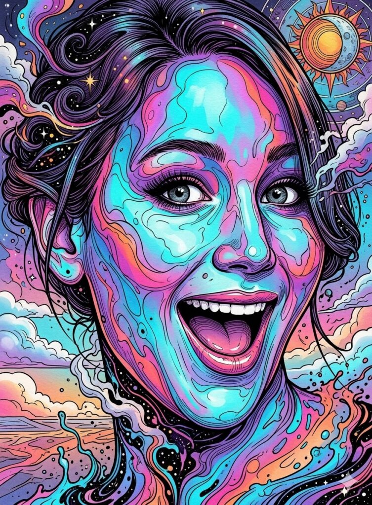 <p>PSYCHEDELIC INK + LIQUID COLOR ILLUSTRATION” PROMPT<br>(IDENTITY LOCK — ABSOLUTE • STYLE LOCK — EXACT MATCH • PROFILE MATCH — REFERENCE)<br>Use the uploaded image as the subject.<br>IDENTITY LOCK — ABSOLUTE (NON-NEGOTIABLE)<br>Preserve exact facial features, proportions, bone structure, and natural asymmetry<br>Maintain original identity with zero reinterpretation<br>Do NOT beautify, smooth, stylize anatomy, or alter ethnicity/age<br>Do NOT change eye shape, spacing, nose structure, lips, or jawline<br>Eyes must remain sharp, correctly aligned, and fully readable<br>The subject must remain instantly recognizable<br>PROFILE MATCH — EXACT REPLICATION<br>Force the subject into the same pose and angle as the reference:<br>• 3/4 angled portrait (NOT full side profile)<br>• Head tilted slightly upward<br>• Chin raised subtly<br>• Eyes looking upward/off-frame<br>• Neck extended elegantly<br>• Maintain correct facial depth and proportions (no flattening or exaggeration)<br>STYLE LOCK — EXACT (CRITICAL)<br>Replicate the exact visual language of the reference image:<br>• Bold black ink linework defining all edges and facial structure<br>• Highly detailed illustrative rendering (NOT painterly realism)<br>• Comic/graphic novel precision + fine line detailing<br>• Smooth color fills combined with ink-defined segmentation<br>• No soft airbrush-only blending — must retain ink structure<br>COLOR SYSTEM — LIQUID PSYCHEDELIC PAINT<br>Apply high-saturation, flowing color fields exactly like the reference:<br>• Use electric cyan, magenta, yellow, orange, pink, blue gradients<br>• Colors behave like liquid pigment / ink diffusion / paint splashes<br>• Paint must wrap around facial contours without altering structure<br>• Include splatters, drips, and fluid transitions<br>• Maintain clean separation between color zones using ink outlines<br>HAIR — FLOWING INK + COSMIC ENERGY<br>Transform hair into dense, swirling ink curls infused with color energy:<br>• Base structure: dark ink-defined curls/strands<br>• Overlaid with flowing color streaks and liquid motion<br>• Integrate cosmic accents (stars, sparks, glowing flecks)<br>• Hair must feel volumetric, dynamic, and wind-driven<br>• Preserve original hair silhouette and density<br>ENVIRONMENT — SURREAL COLORSCAPE<br>Create a fully illustrated, highly detailed surreal environment:<br>• Stylized clouds, sky gradients, abstract terrain<br>• Celestial elements (sun, moon, glowing sky forms)<br>• Layered composition: foreground paint / mid clouds / distant landscape<br>• Background must follow same ink + color illustration style<br>SUBJECT–BACKGROUND INTEGRATION<br>• Paint and color flows must merge seamlessly into the environment<br>• Edges dissolve into liquid, smoke, or pigment transitions<br>• No hard cutout — full visual continuity<br>RENDER QUALITY<br>• Ultra-clean linework (no noise, no sketchiness)<br>• High detail density across entire image<br>• Crisp edges, sharp focus<br>• 4K–8K resolution<br>• Balanced contrast to preserve facial readability<br>NEGATIVE CONSTRAINTS (STRICT)<br>No realism-only rendering<br>No painterly blur or soft-only blending<br>No broken anatomy or warped features<br>No misaligned eyes<br>No dull/desaturated colors<br>No flat or low-detail areas<br>No deviation from ink + graphic illustration style<br>If you want the MAX LOCK version, I can tighten it further so:</p>