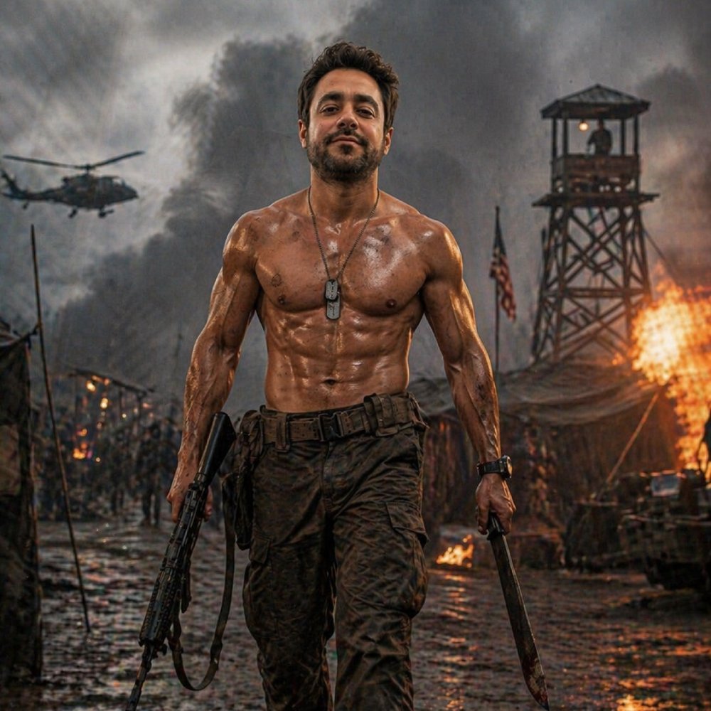 <p>Create a hyperrealistic 8K action image of a shirtless, muscular young man in a Rambo-style pose, holding a rifle in one hand and a machete in the other. He wears military pants and has a powerful, toned physique. Behind him, a military base camp is engulfed in flames and smoke, with destroyed structures and chaos in the background, creating an intense combat scene with dramatic lighting and cinematic depth. Use mi image for reference.</p>