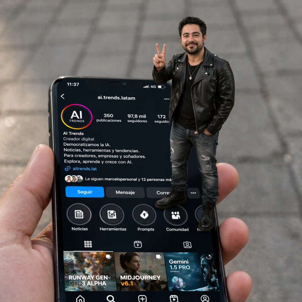 <p>An ultra-photorealistic close-up photograph of a hand holding a dark modern smartphone (e.g., Space Gray iPhone). Standing on the phone’s surface, popping out of the screen, is a highly detailed miniature, full-body man, Uploaded face as reference, with a beard and smiling, giving a peace sign. He is wearing a black leather jacket, t-shirt, chain, distressed jeans, and boots. The phone screen clearly displays the detailed Instagram profile for ‘AI Trends’ with specific stats, bio, and buttons. Hand and miniature are in sharp focus, with a softly blurred urban pavement background in natural daylight. Cinematic composition, 8k, detailed textures. Surreal elements, artistic exaggeration, perspective manipulation, or Photoshop-altered composition.</p>