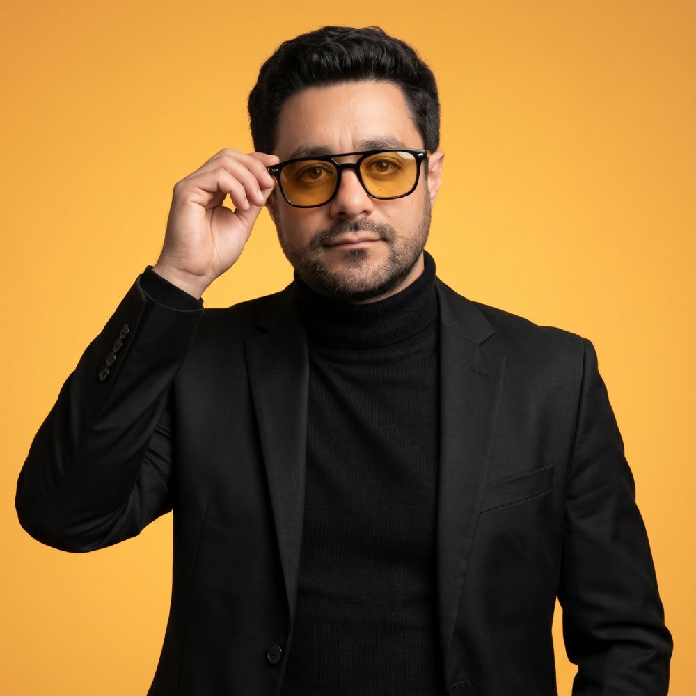<p>The subject wears a tailored black suit jacket over a fitted black turtleneck. He wears black-framed glasses with warm yellow-tinted lenses. His right hand is raised naturally, gently adjusting the glasses near the temple, while the other arm rests in pocket. Facial expression is calm, confident, and composed, with direct eye contact toward the camera.<br>Background & Color</p>