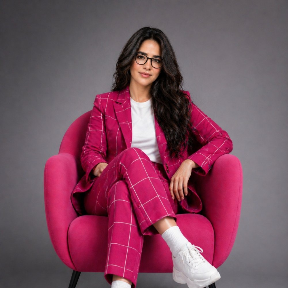 <p>Striking and modern advertisement features an attractive and elegant woman (use the uploaded image as a reference for the face) wearing glasses, sitting facing the camera with confidence on a modern and bold pink armchair. She wears a magenta suit with white, simple geometric patterns[horizontal and vertical lines], paired with thick white sneakers and white socks.<br>The background is a minimalist gray gradient, with clean studio lighting in a photography style. The aesthetic is minimalist, fun, and modern. The look is ultra-clean and vibrant, with an editorial style. Aspect ratio: 4:5 vertical.</p>