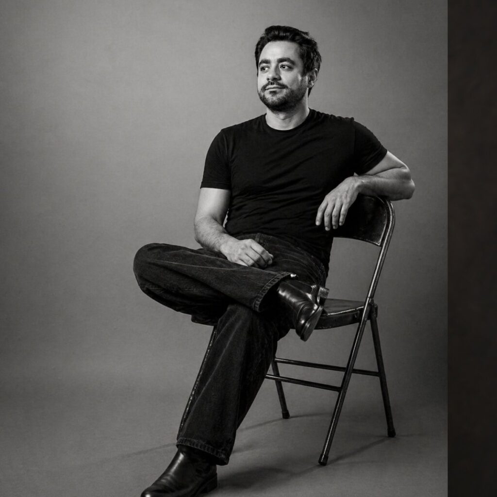 <p>Ultra-realistic, high-end monochrome studio portrait of a man (use uploaded image as facial reference — preserve 100% identity, proportions, skin texture, and expression). The character should have a horizontal gaze looking to the left. Scene & Environment: Seated casually on a vintage metal folding chair in a seamless dark burnt studio environment (floor and background fully merged, no visible horizon line). Matte finish, minimal, clean editorial aesthetic. Composition & Framing: Full-body portrait, vertical 4:5 aspect ratio. Subject positioned slightly RIGHT of center. Feet fully visible (no cropping). Balanced negative space on the right side. Eye-level camera angle with subtle cinematic depth. Pose & Expression: Relaxed seated pose. Other hand relaxed near the lap. Use a light gray, minimalist background. Expression calm, confident, with a calm confident expression. Wardrobe: Minimal modern monochrome styling: – fitted black t-shirt – loose black denim jeans (baggy fit) – polished black leather boots Lighting: Soft directional studio lighting from front-rifht. Gentle highlights on face and upper body. Subtle shadow falloff. Moody shadows on floor and backdrop. Warm tonal harmony with burnt-orange background. No harsh highlights or overexposure. Camera & Quality: 85mm lens f/2.8 aperture Shallow depth of field Sharp focus on subject High dynamic range Ultra-detailed textures (skin, fabric, hair) No skin smoothing or artificial glow 8K resolution Style: Modern editorial fashion photography Minimal, cinematic, refined Clean composition, premium aesthetic. 🎞 Monochrome Treatment True black & white (not desaturated color) Deep blacks, bright highlights Rich midtone contrast Fine film grain (subtle, cinematic) No color tinting</p>
