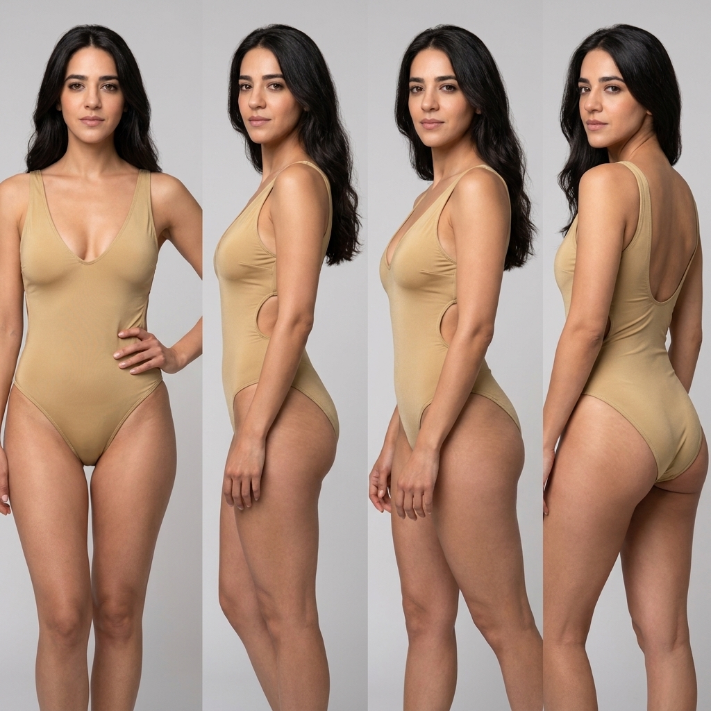 <p>As reference image, ultra-photorealistic studio photoshoot with a plain light gray or white seamless background. The subject must exactly match the reference image with no changes to face, body, skin, eyes, or hair. No reinterpretation or beautification. Composition: four side-by-side images of the same subject in different poses, maintaining perfect identity consistency across all frames. Poses: front-facing pose with one hand on the hip side profile emphasizing natural silhouette three-quarter turn back/side pose highlighting posture Expression: neutral to confident, calm and composed gaze. Outfit: a one-piece swimsuit in soft neutral tones (gold/beige style), form-fitting with realistic fabric behavior, featuring a deep neckline, high-cut legs, and subtle side cutouts. Fabric must show natural tension, stretch, and clean edges. Lighting: soft, even studio lighting with minimal shadows, clean and balanced illumination across the subject. Camera: high-end fashion photography look, sharp focus, clean background, no distortion, natural detail retention. Textures: highly detailed—smooth fabric surface, realistic stretch, natural skin texture with pores and subtle variation. Style: fashion/beauty photography, clean, polished, confident aesthetic. Negative prompt: different face, altered identity, unrealistic proportions, plastic skin, over-smoothing, CGI look, extra limbs, distorted anatomy, text, logos<br><br><br><br></p>