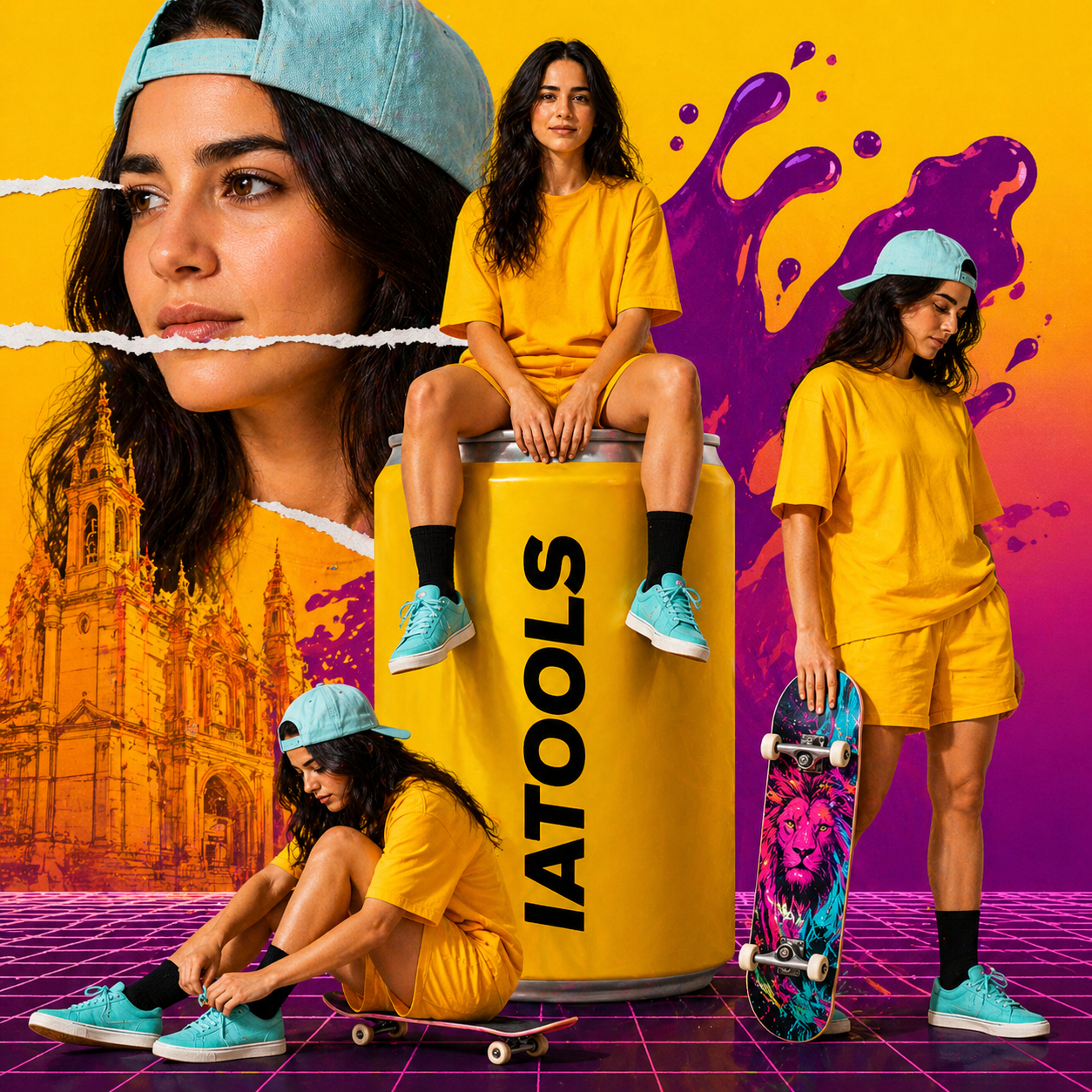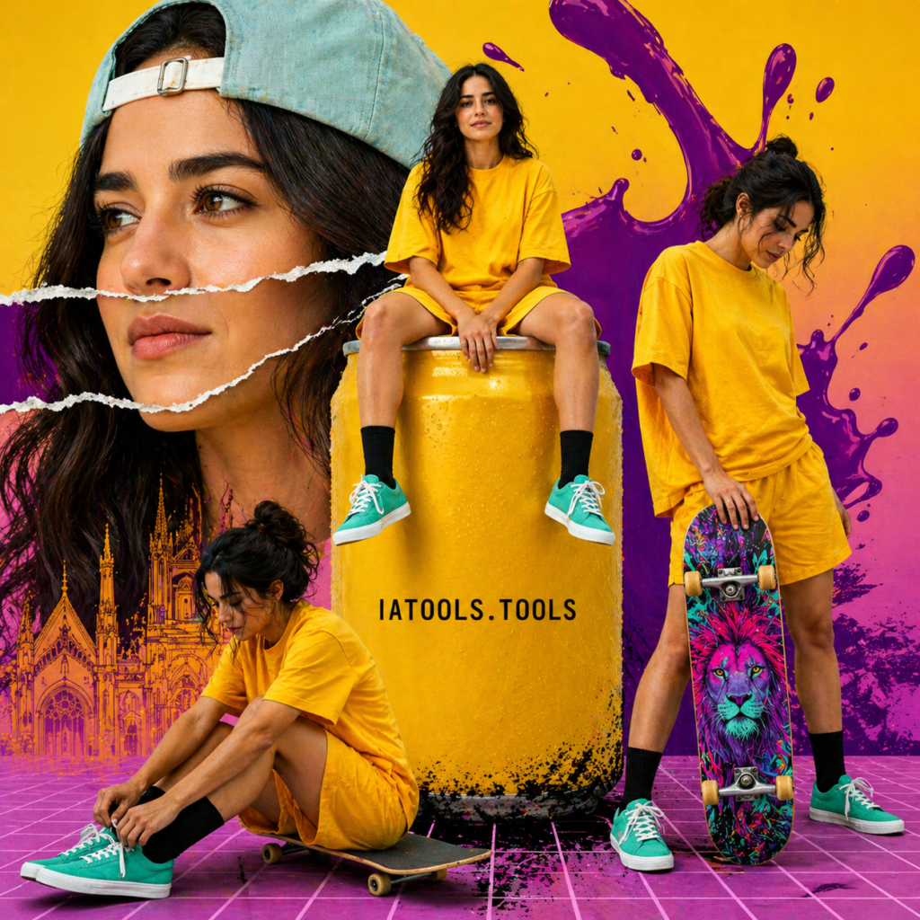 <p>A high-contrast, vertical digital collage composition in the style of a sports advertisement. The main subject is [GENDER BLOCK] (reference image provided —<br>maintain perfect consistency of face, body proportions, and skin tone across all<br>instances) skateboarder (image 1, maintaining perfect consistency between face, body, and skin tone) depicted in four different scales and poses interacting within a surreal graphic space.</p>